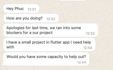 Một anh bạn người Ấn, đang sống ở Sing & làm việc cho một công ty Mỹ 😄, nhắn tin cho tôi trên Whatsapp hỏi làm một dự án Flutter nhỏ trong vòng vài tuần.